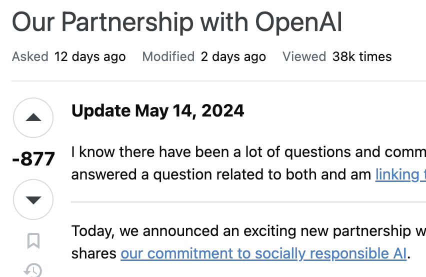 There is an Q and A on Stack Overflow meta regarding OpenAI partnership that question has 877 downvotes as of 18th May 2024 🤯. This is the lowest rated answer I have ever seen on the Stack Overflow. Link here: https://meta.stackexchange.com/questions/399619/our-partnership-with-openai